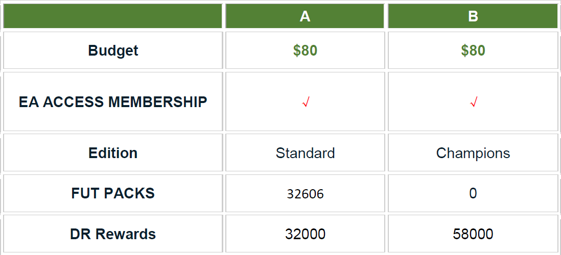 Gamer A and Gamer B have a budget of $80 each, and both join in EA Membership. Gamer A orders Standard Edition and spends the rest $20 on points, equal to 14 x 7500 packs; according to the pricing and statistics in FUT 20, Gamer A could get 32606 coins from the packs. And in the 10 hours access from EA membership, Gamer A could reach Level 3-5 of Division Rivals to get the rewards of 32000 coins. Thus, Gamer A could get 64606 coins in total.