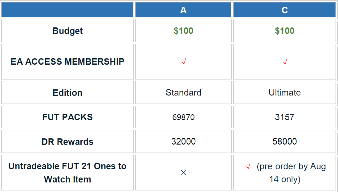 For example, Gamer A and Gamer C have a budget of $100 each, and both join in the membership. Gamer A orders Standard Edition and spends the rest $40 on points to open 30 packs on Oct. 1, 2020, to get 69870 coins; alike, in the 10 hours access from EA membership,